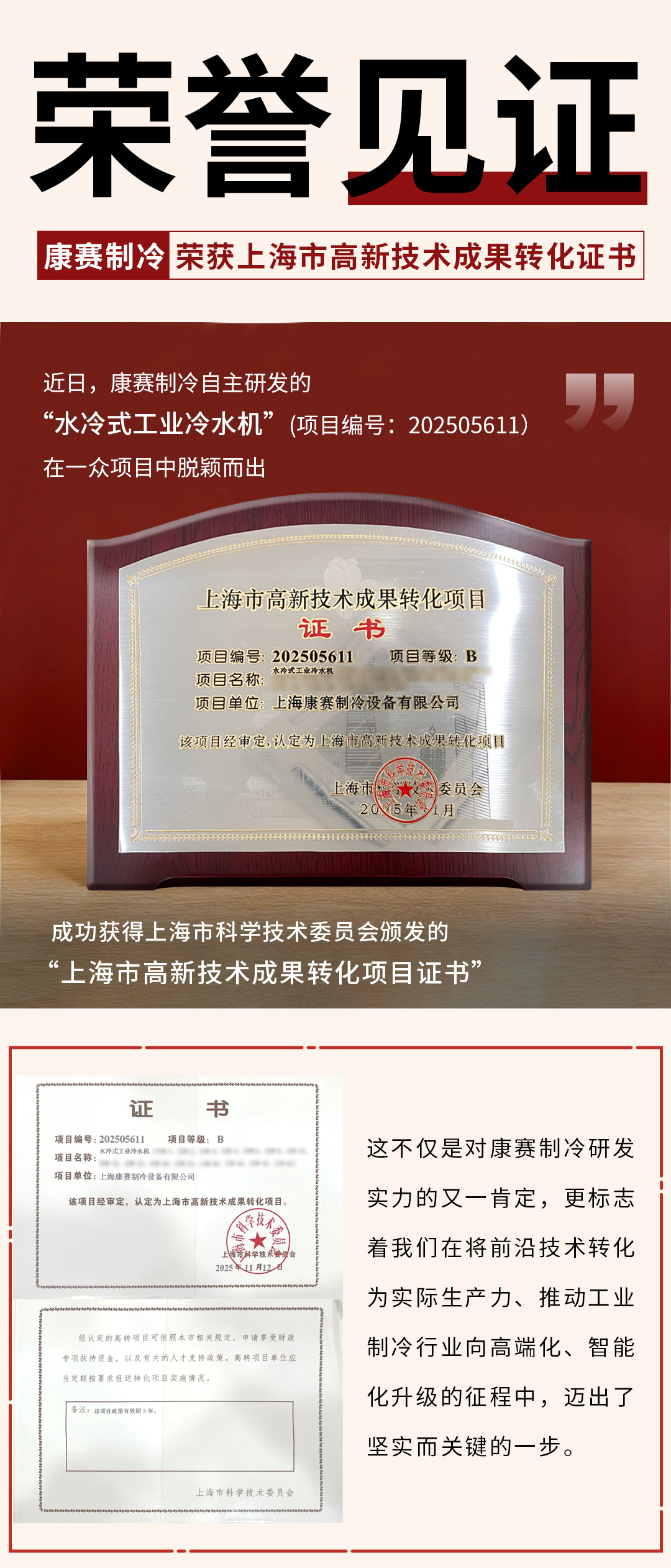 创新实力再获认可!康赛制冷“水冷式工业冷水机产品”荣获上海市高新技术成果转化项目